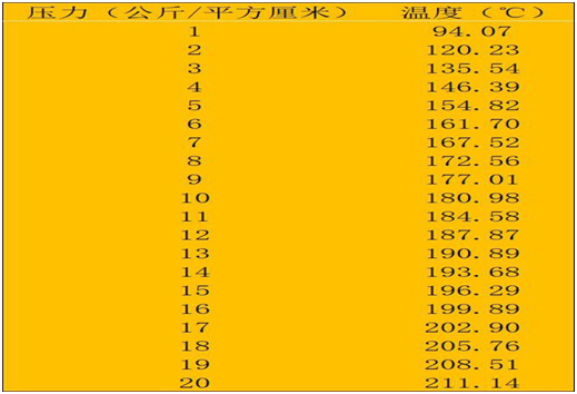 按1MPa=1000kPa=10.2kgf/cm2(公斤/平方厘米),對照飽和蒸汽壓力(MPa表示)與蒸汽溫度的標準表,可以計算得到飽和蒸汽壓力(kgf/cm2表示)與蒸汽溫度之間的關(guān)系,如下所示: