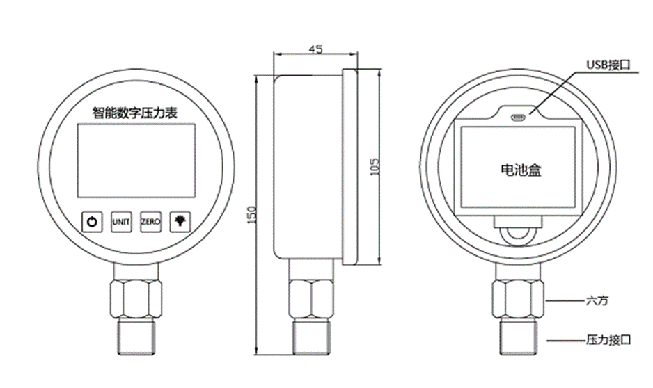 SUAY80數(shù)字壓力表是一款高精度智能型數(shù)字壓力表,內(nèi)置高精度壓力傳感器,能夠?qū)崟r顯示壓力,并且具有精度高、長期穩(wěn)定性好的特點。配備4位顯示的大尺寸LCD液晶顯示,具有清零、背光、開關(guān)機、單位切換、低電壓報警、峰值記錄等多種功能,操作簡單,安裝方便。殼體和接頭采用304不銹鋼,抗震性好,能夠測量氣體、液體、油等對不銹鋼無腐蝕的介質(zhì)。用3節(jié)5號電池供電,也可以采用USB供電,續(xù)航功耗低、時間長,適用于便攜式壓力測量、設(shè)備配套、校驗設(shè)備等壓力測量領(lǐng)域